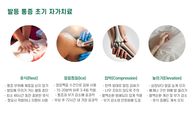 👉 R.I.C.E 요법과 발등 압박 완화가 기본입니다.