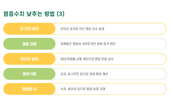 - 유산균, 발효식품 섭취 → 장내 유익균 증가 → 전신 염증 감소