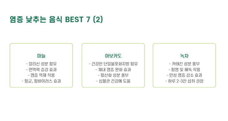 | 녹차 | 카테킨 – 항염 및 해독 작용 |