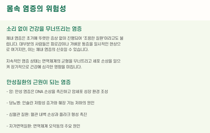 ‘조금 피곤해서 그런가’ 하고 넘기기 쉽지만, 지속적인 체내 염증은 암, 당뇨, 심혈관 질환 등 만성 질환의 근원이 될 수 있습니다.
