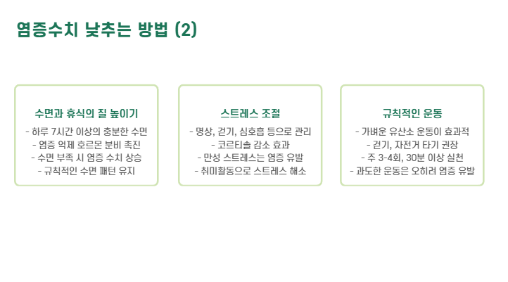 - 가벼운 유산소 운동(걷기, 자전거 타기)은 염증 수치 감소에 효과적