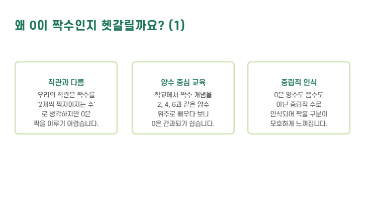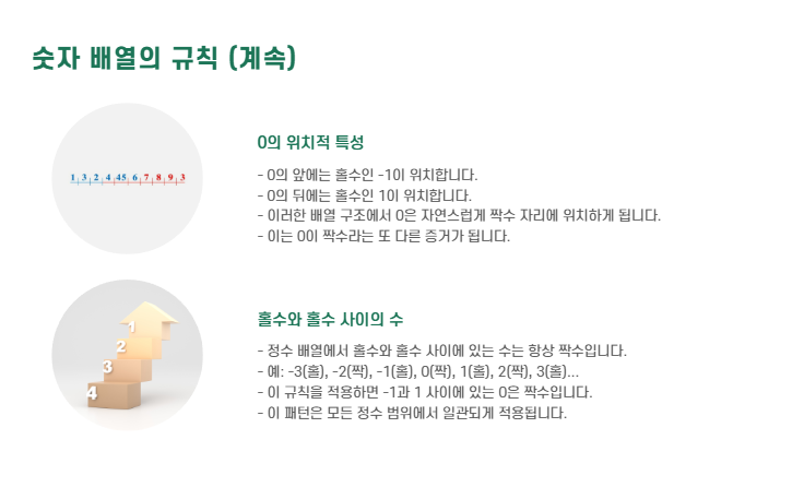 💡 이처럼 정수의 배열 패턴만 봐도, 0은 자연스럽게 짝수 자리에 위치하게 됩니다.