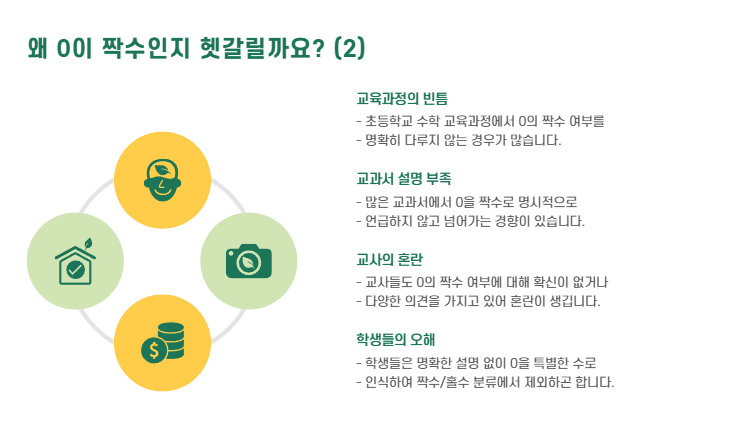 초등학교 교과서 등에서 0의 짝수 여부를 명확히 다루지 않는 경우가 많아, 학생들이 혼란을 겪는 경우가 많습니다.