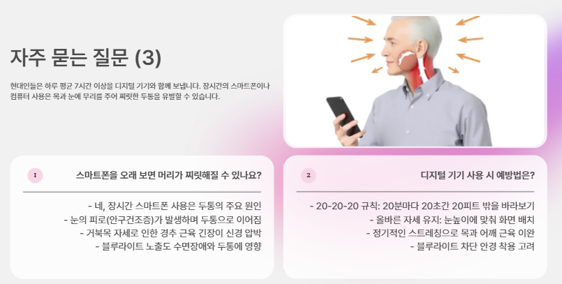 | 눈 피로 | 장시간 스마트폰, PC 사용으로 인한 안구 긴장 → 두통 유발 |