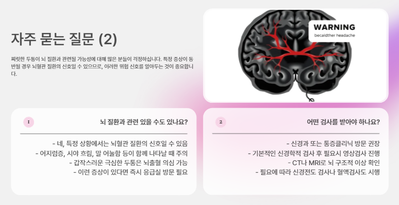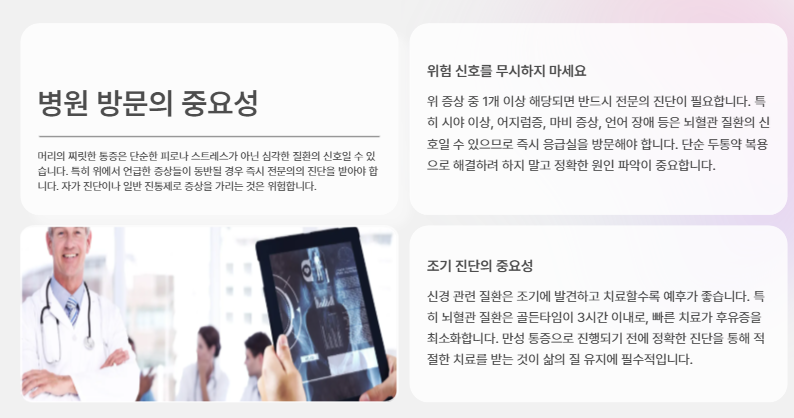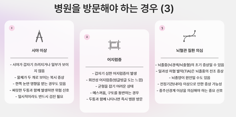 💡 위 증상 중 1개 이상 해당되면 반드시 전문의의 진단을 받아야 하며, 단순 두통약 복용으로 해결하려고 하지 말고, 조기에 원인을 파악하는 것이 중요합니다.