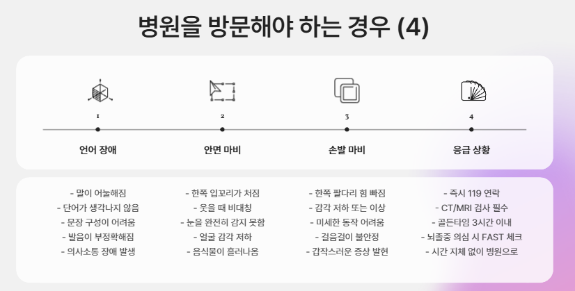 - 의심 질병: 뇌졸중(뇌경색/뇌출혈), 일과성 허혈발작(TIA), 안면신경마비