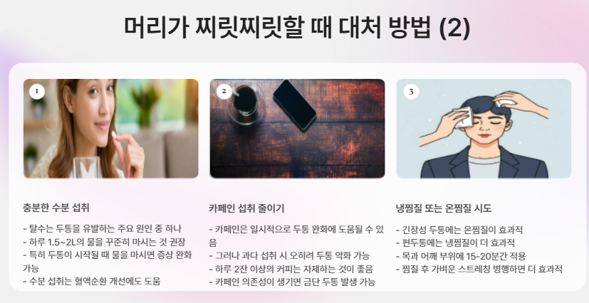 → 일시적으로 도움이 될 수 있으나, 과다 섭취 시 두통 악화 - 냉찜질 또는 온찜질 시도