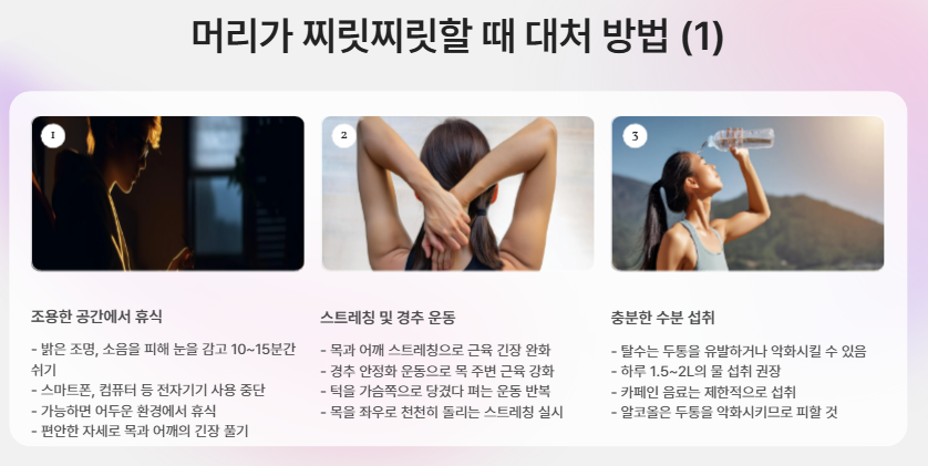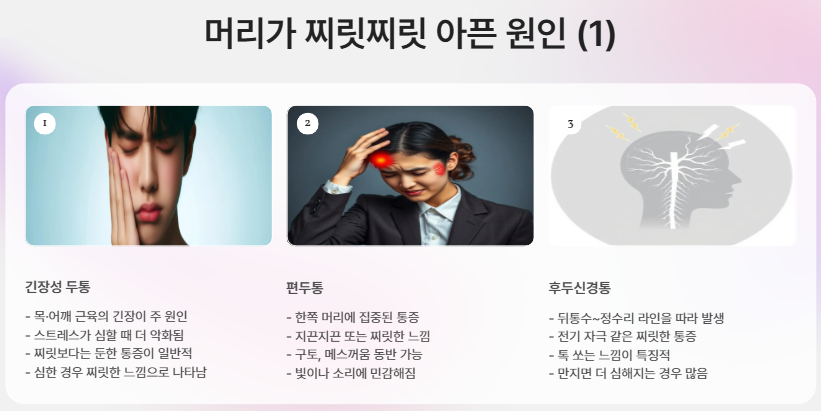 | 긴장성 두통 | 가장 흔한 두통 유형으로, 목·어깨 근육의 긴장이 원인. 찌릿보다는 둔한 통증에 가깝지만 스트레스가 심하면 찌릿한 느낌으로 나타나기도 함 |