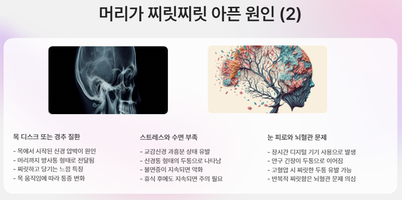 | 목 디스크 또는 경추 질환 | 목에서 시작된 신경 압박이 머리까지 방사통을 유발. 찌릿하고 당기는 느낌 |