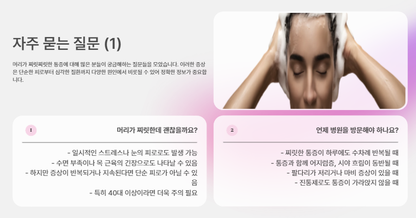| 고혈압/뇌혈관 문제 | 순간적인 찌릿함이 반복적으로 발생하거나 어지럼증, 시야 이상 동반 시 즉시 병원 진료 필요 |