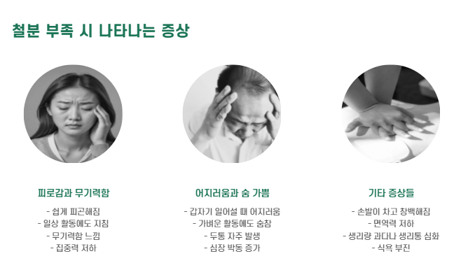 철분은 혈액 속 산소를 실어 나르는 ‘헤모글로빈’을 만드는 재료입니다. 철분이 부족하면 다음과 같은 증상이 생길 수 있습니다.