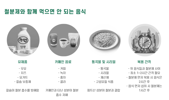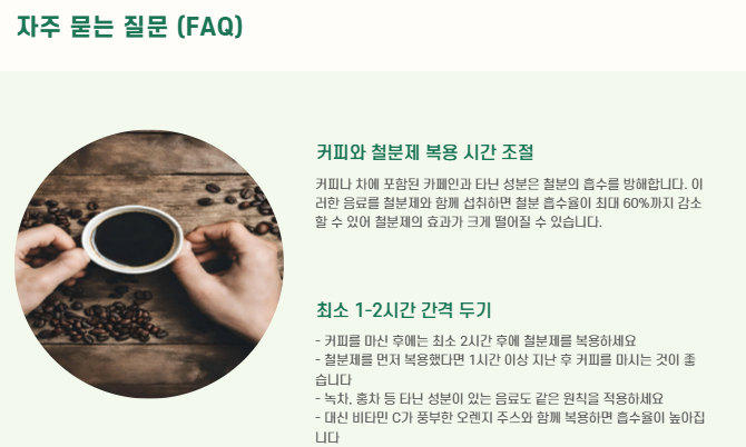 👉 최소 1~2시간 간격을 두는 게 좋아요. 커피 먼저 마셨다면 철분제는 2시간 뒤에!