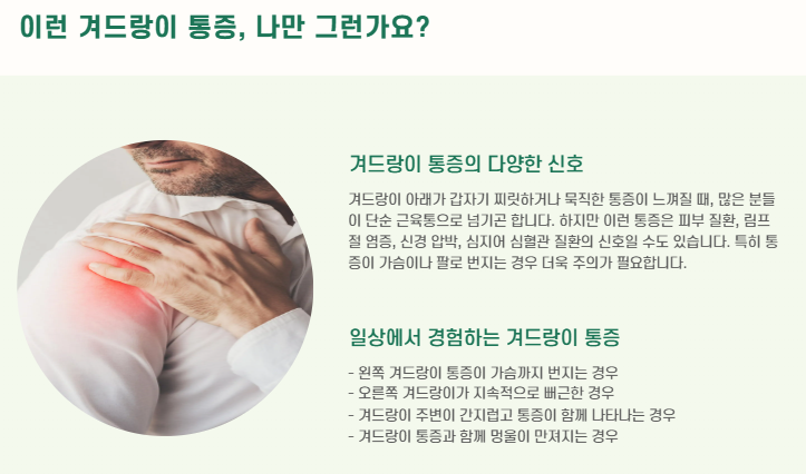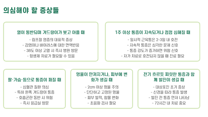 갑자기 겨드랑이 아래가 찌릿하거나 묵직한 통증이 느껴질 때, 많은 분들이 단순히 근육통으로 넘기곤 합니다. 하지만 이 통증이 피부 질환, 림프절 염증, 신경 압박, 심지어 심혈관 질환의 신호일 수도 있다는 사실, 알고 계셨나요?