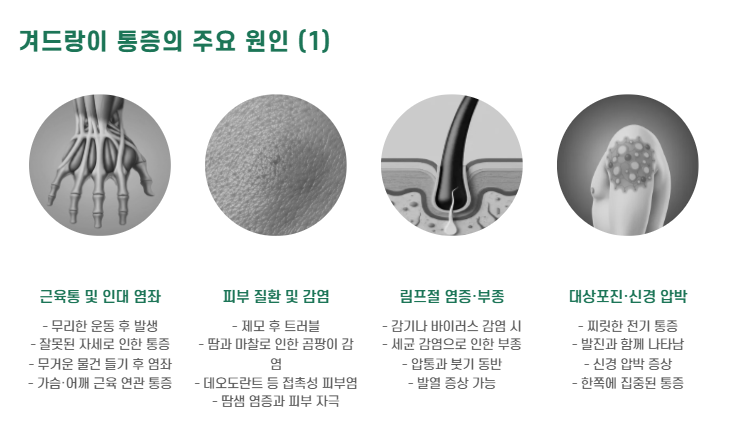 무리한 운동, 잘못된 자세, 무거운 물건 들기 등으로 가슴·어깨 근육에 염좌가 생기면 겨드랑이까지 통증이 번질 수 있어요. - 피부 질환 및 감염