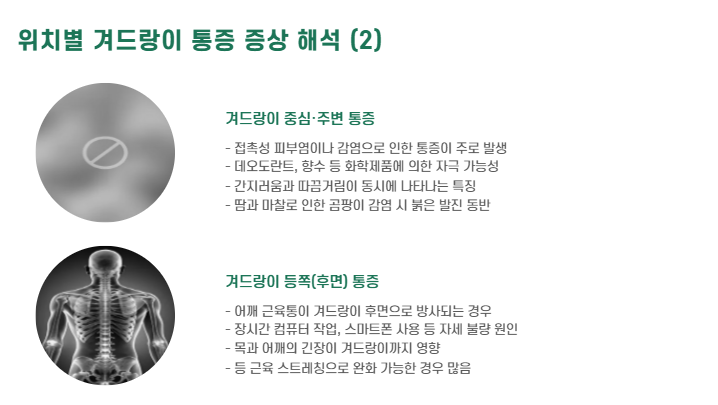 | 겨드랑이 중심·주변 | 접촉성 피부염, 감염 | 간지러움 + 따끔함 동반 |
