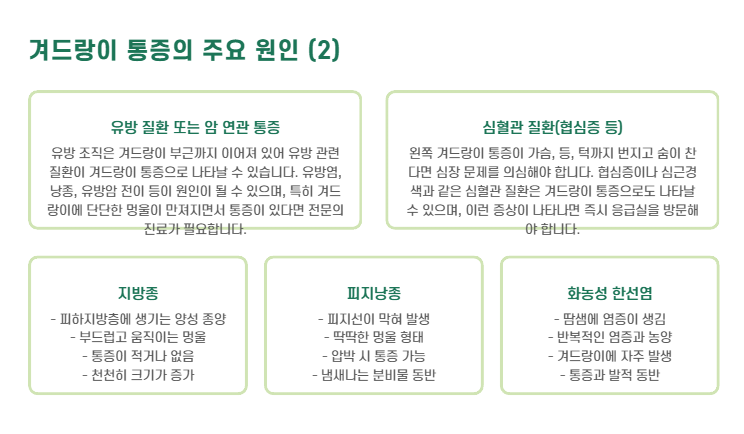 왼쪽 겨드랑이 통증이 가슴·등·턱까지 번지고 숨이 찬다면, 심장 문제일 수 있어 즉시 병원 진료가 필요합니다. - 지방종, 낭종, 종양