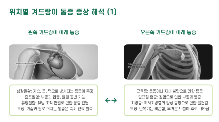 | 왼쪽 겨드랑이 아래 | 심장질환, 림프절염, 유방질환 | 가슴·팔로 전달되는 통증 주의 |