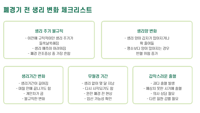 👉 생리 패턴이 불규칙하게 바뀌는 것이 가장 흔한 폐경 전조증상입니다.