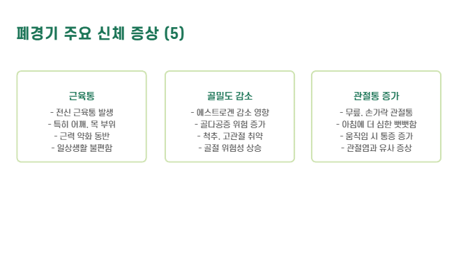 → 골밀도 감소, 뼈 약해짐, 관절통 증가