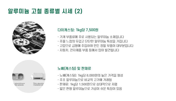 | 알루미늄 종류 | 1kg당 시세(원) | 특징/설명 |