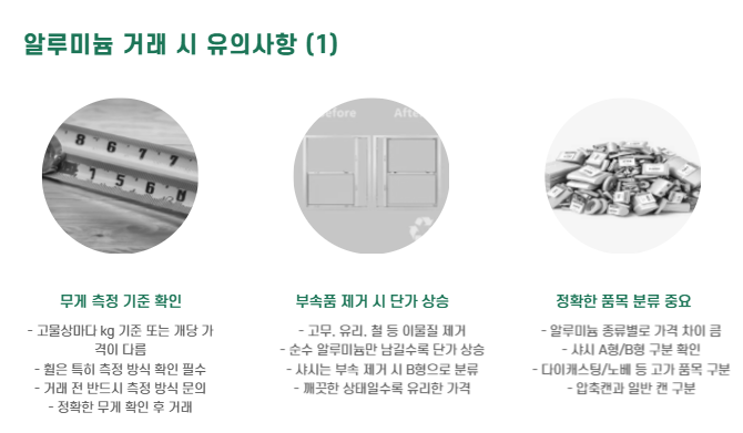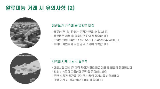 → 고무, 유리, 철 제거하면 순도 높은 알루미늄으로 고가 거래 가능 - 청결도도 가격에 영향