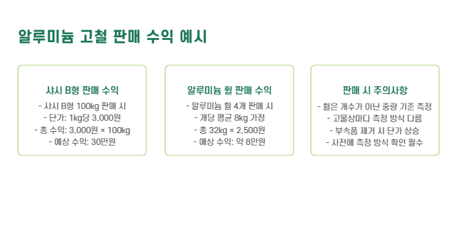 → 3,000원 × 100kg = 30만 원 수익 - 알루미늄 휠 4개, 개당 8kg 가정 시