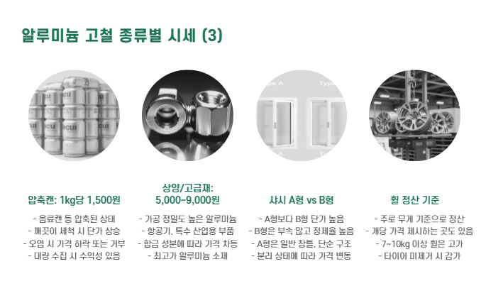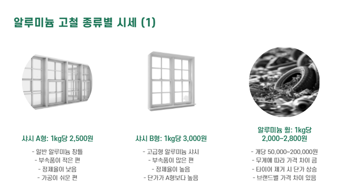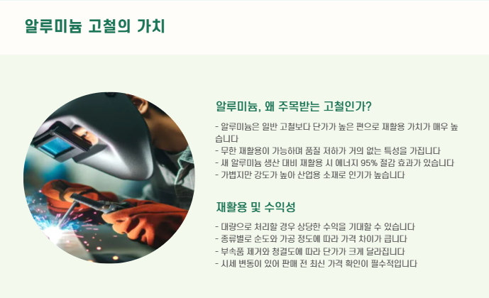 고철 중에서도 알루미늄은 단가가 높은 편이라, 재활용하거나 대량으로 처리할 때 예상 수익을 미리 계산해두는 것이 중요합니다.