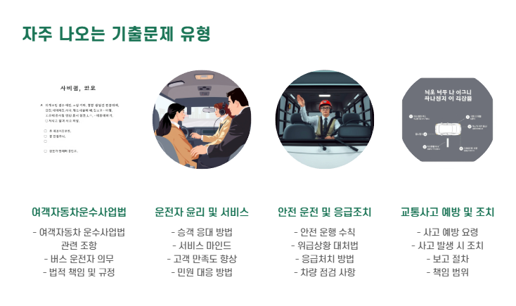 특히 ‘여객자동차운수사업법’ 조항과 운전자 윤리/서비스 교육 관련 문항은 반복 출제됩니다.