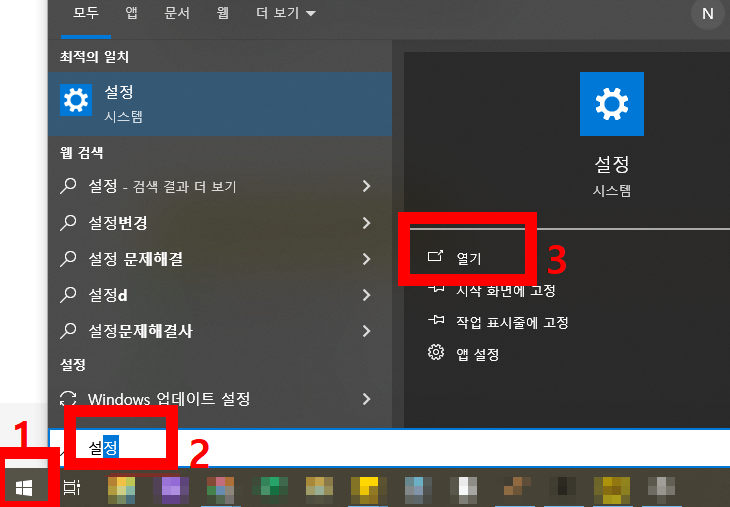 - 컴퓨터 왼쪽 아래 윈도우 모양 클릭 - [설정]이라고 입력 후 설정[열기] 클릭