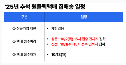 | 상온·일반 택배 | 10월 1일(수)~2일(목) 접수 마감 | 대부분 택배사 기준 |