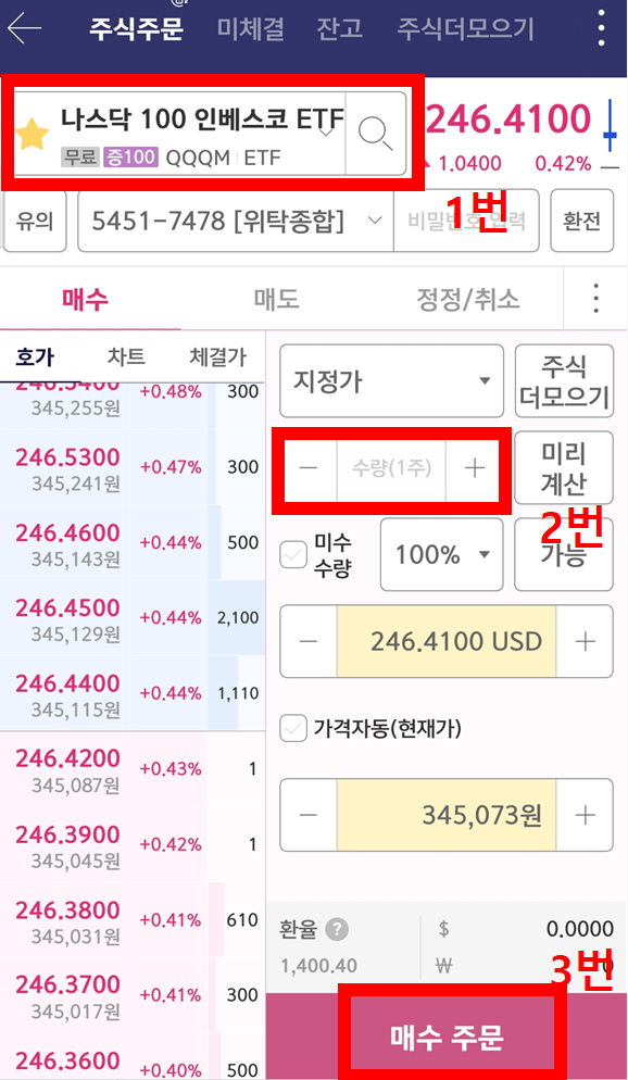 ✅ 1번 클릭 후 원하는 종목 검색 -> 2번에 매수 수량 넣고 -> 3번 매수 주문