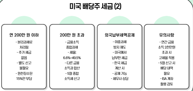 - 200만 원 초과: 금융소득종합과세(6.6%~49.5%)