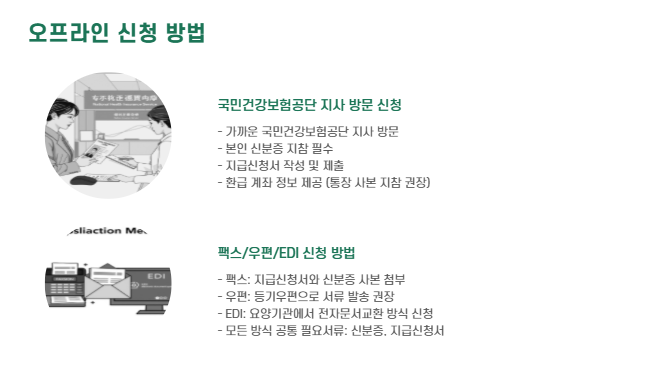 - 국민건강보험공단 지사 방문 또는 팩스 / 우편 / EDI 방식으로 신청 가능