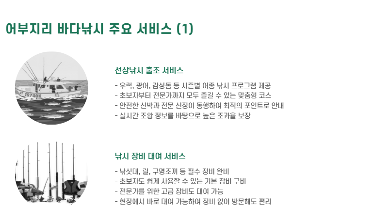 - 선상낚시 출조 : 우럭, 광어, 감성돔 등 시즌별 어종 낚시