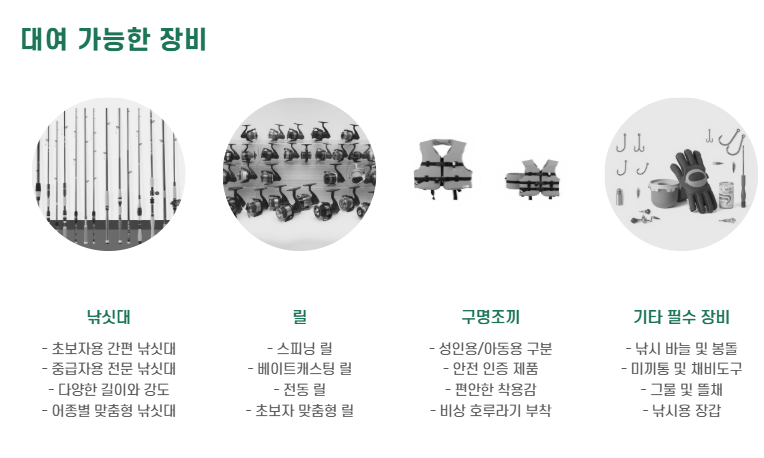 - 낚시 장비 대여 : 낚싯대, 릴, 구명조끼 완비