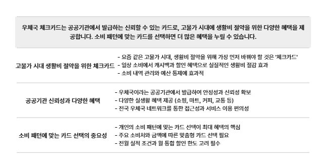 우체국 체크카드는 공공기관에서 제공하는 안정성과 실생활 중심 혜택이 강력한 무기입니다.