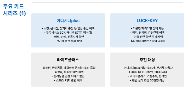 | 어디서나plus | 쇼핑, 음식점, 전기차 충전 등 일상 중심 혜택 | 일반 소비자, 전기차 사용자 |