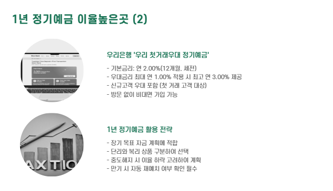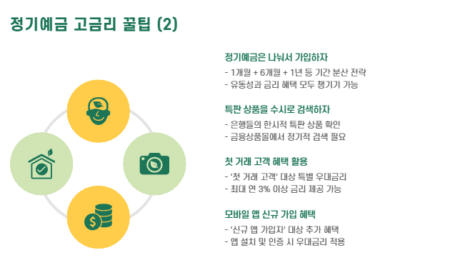 - 1개월 + 6개월 + 1년 등 기간 분산 전략으로 유동성과 금리 혜택 모두 챙기기.