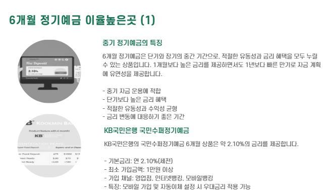 | 6개월 | KB국민은행 | 국민수퍼정기예금(6개월) | 약 2.10 % |