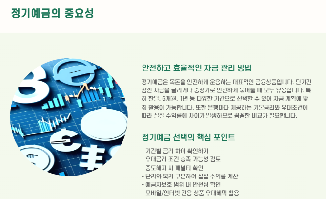 특히 한 달, 6개월, 1년처럼 기간별로 선택할 수 있는 정기예금이 있고, 조건에 따라 우대금리가 붙는 경우가 많습니다.
