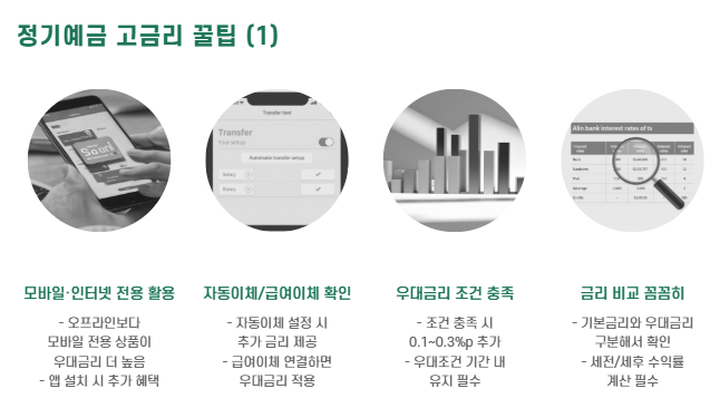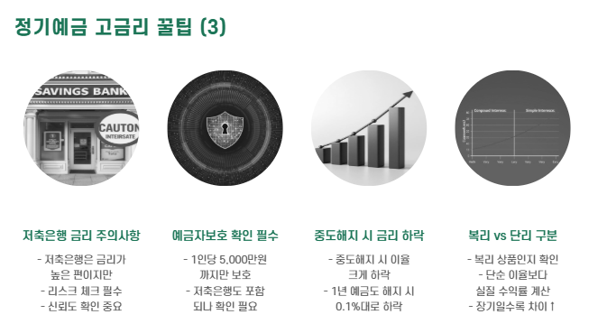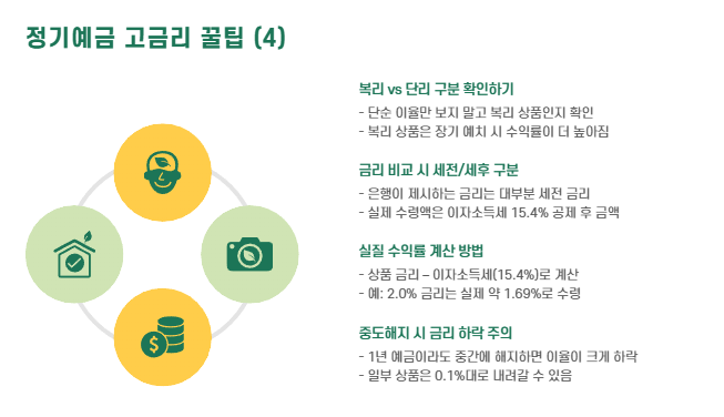 - 단순 이율 외에도 복리 상품인지 확인하면 실질 수익률을 높일 수 있음.