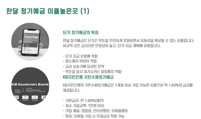 | 1개월 | KB국민은행 | 국민수퍼정기예금(1개월 이상) | 약 1.60 % |