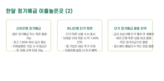 | 신한은행 | 일반 정기예금 또는 특판 활용 가능 | 최고 1.60% 이상 | |