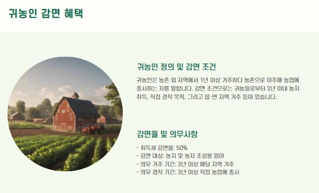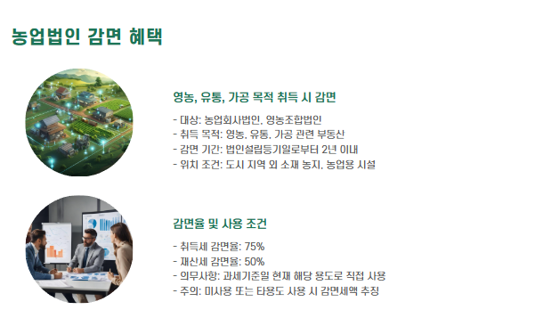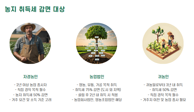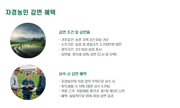 - 직접 경작 목적으로 농지를 구입할 경우, 최대 50% 감면