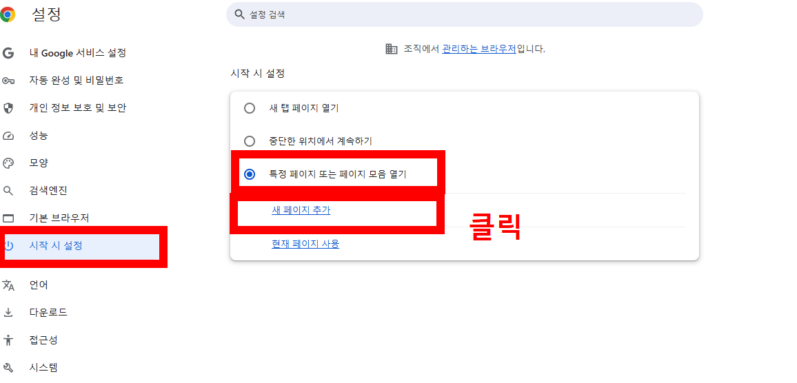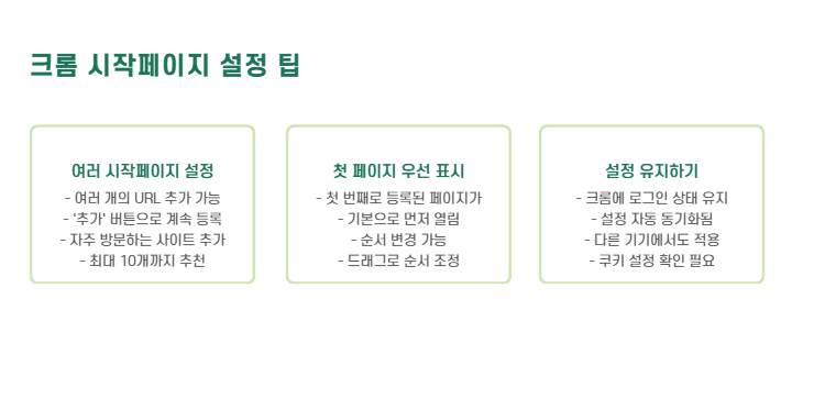 💡 시작 페이지는 여러 개 설정할 수도 있어요. 그중 첫 번째로 등록된 페이지가 기본으로 열립니다.