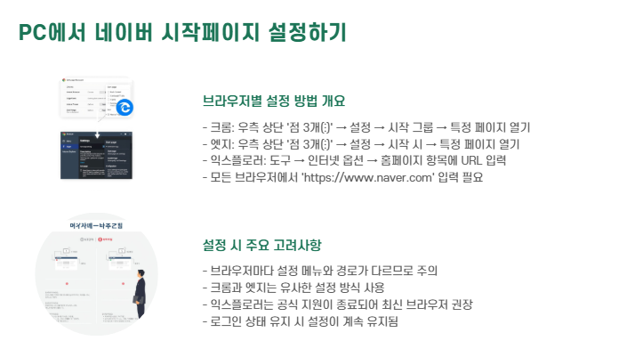 이번 포스팅에서는 '네이버를 시작페이지로 설정하는 방법’을 PC(크롬, 익스플로러)와 모바일 브라우저 기준으로 상세하게 알려드리겠습니다.