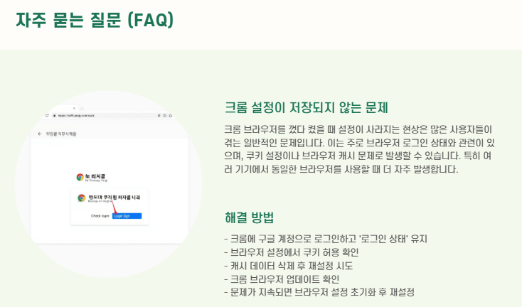 A. 크롬 로그인이 되어 있지 않거나, 설정이 저장되지 않은 경우입니다. ‘로그인 상태’를 유지하고 설정을 저장해 주세요.