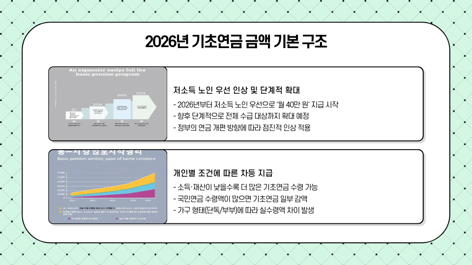 일부 언론에서는 ‘2026년 기초연금 월 40만 원 시대’라는 제목을 볼 수 있지만, 이건 전체 수급자에게 동일 적용되는 금액이 아니라 저소득층 우선 인상 기준입니다.