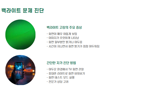 | 백라이트 고장 | 화면에 손전등 비춰보고 흐릿한 영상 확인 후 수리 |