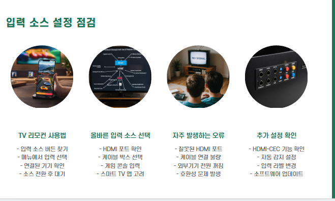 - HDMI, 셋톱박스, 게임기 등이 연결된 포트가 다르게 선택되어 있으면 화면 출력이 안됨